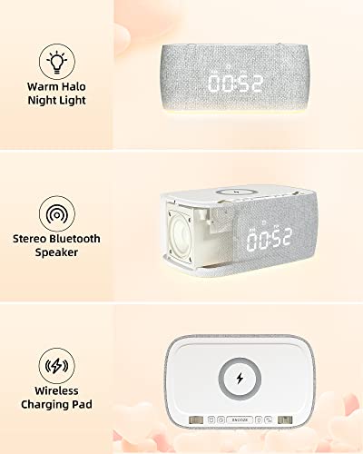 [ 6-in-1 Alarm Clock Radio with Charging Station] Large clock display, Bluetooth speaker, FM radio, Wireless Phone Charger, Night light, USB-C PD Fast Charger. The fast alarm clock charging station provides power up to 7.5W for iOS and 10W for Android devices.